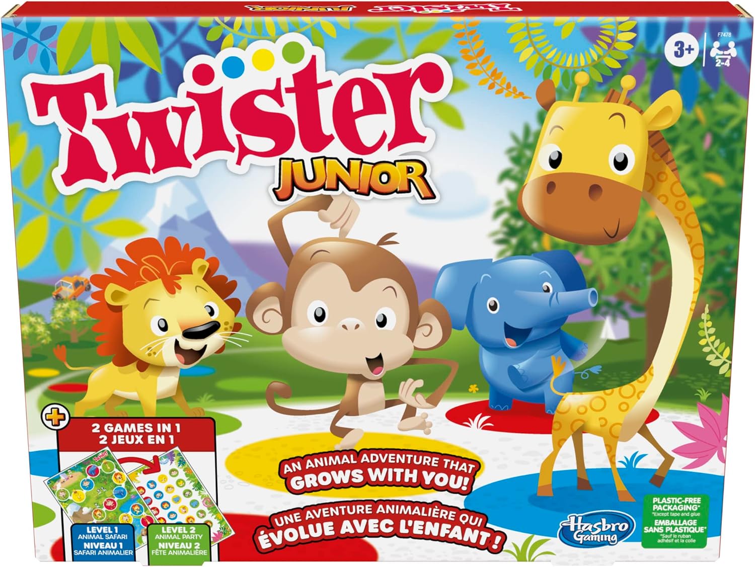 - 2 jeux en 1 : ce jeu Twister Junior double le plaisir avec un tapis double face et une planche à roulettes réversibles. Jouez au jeu Animal Safari d'un côté et au jeu Animal Party de l'autre